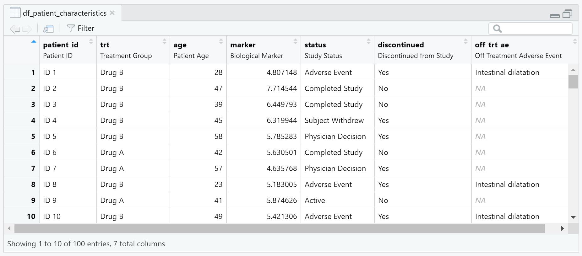| patient_id | trt | age | marker | status | discontinued | off_trt_ae |
