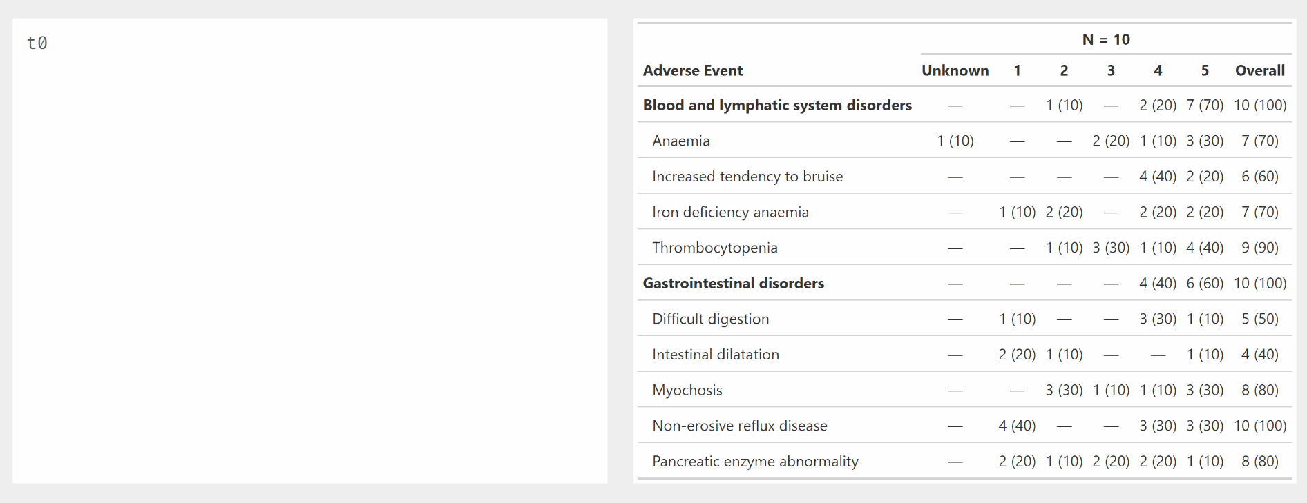 Multiple AE tables are often required (treatment emergent AEs, AEs on specific treatment cycles, serious AEs, etc.).
