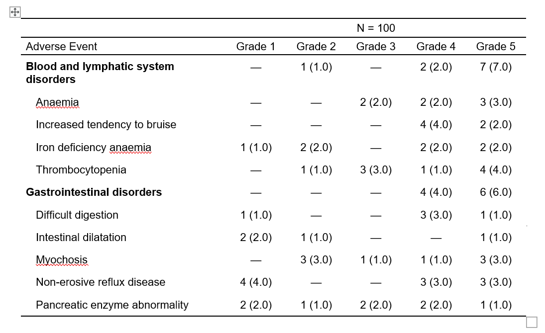 | Blood and lymphatic system disorders | — | 1 (10) | — | 2 (20) | 7 (70) |