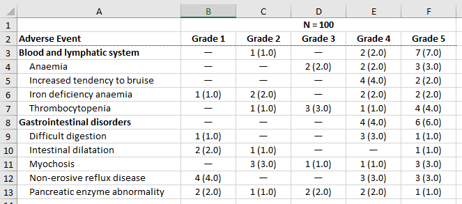 Multiple AE tables are often required (treatment emergent AEs, AEs on specific treatment cycles, serious AEs, etc.).