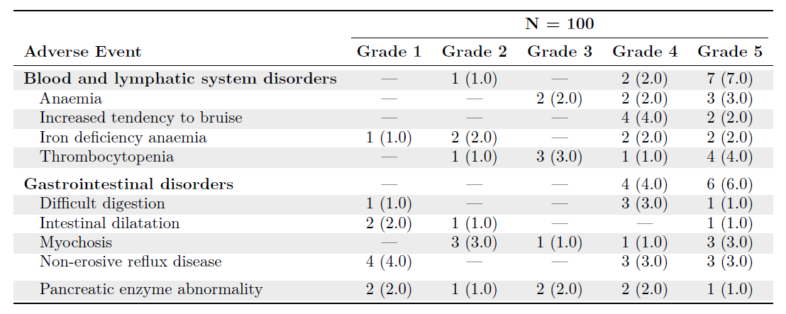 | Blood and lymphatic system disorders | — | 1 (10) | — | 2 (20) | 7 (70) |